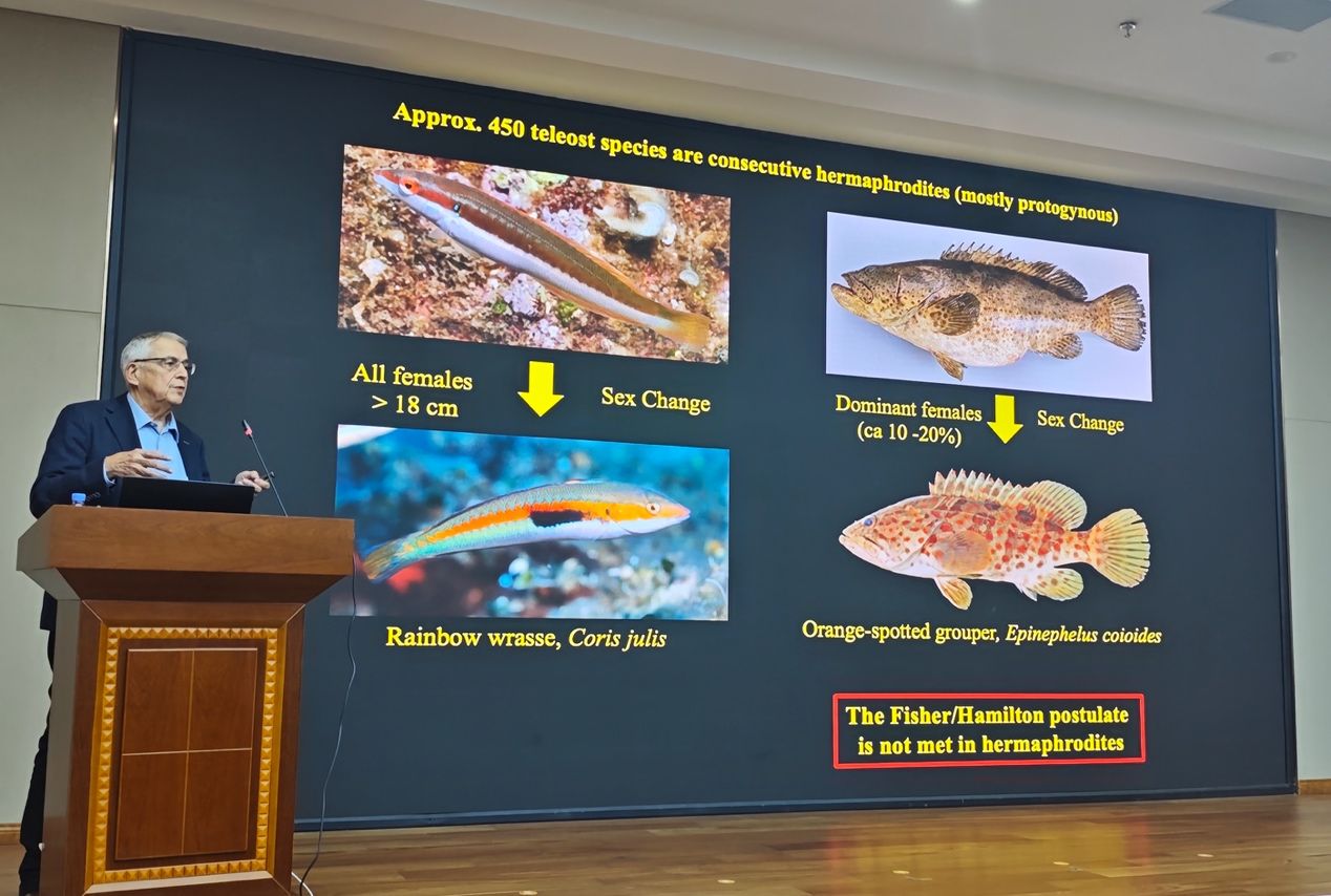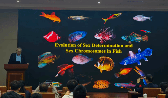23日,陈松林院士主持,Manfred Schartl教授应邀作题为“Evolution of sex determination mechanisms and sex chromosomes in fish”的学术报告,系统介绍了其团队在鱼类性别决定分子机制、性染色体演化研究方面的最新进展,深入探讨了基因组进化与性别调控之间的关系。报告内容前沿、信息丰富,引起了与会人员的极大兴趣和热烈讨论。