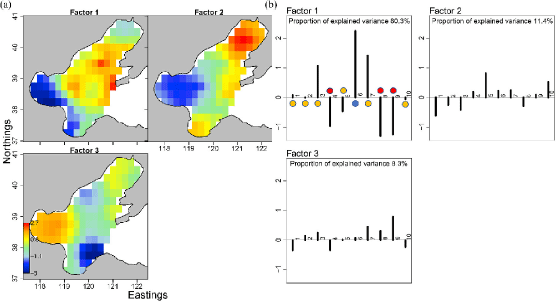 相遇概率空间变化的3个因子的空间效应和各鱼种对各因子的估计载荷