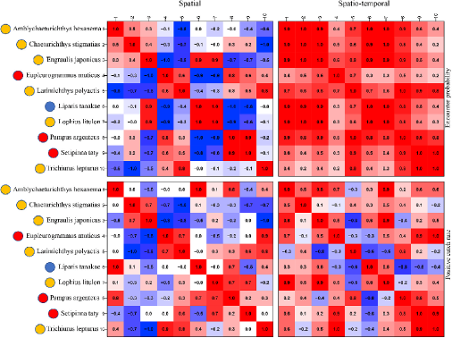 团队基于渤海10种关键鱼类10年渔业资源调查数据,构建了多物种时空模型(VAST),研究发现:1)渤海低经济捕食者种类的双重角色:细纹狮子鱼和黄鮟鱇等低经济价值捕食者与重要饵料鱼鳀呈现显著空间正相关(热点区域重叠率达88%以上);并且这些捕食者资源量近年来持续上升,对小黄鱼、银鲳等高经济价值鱼类产生强烈负作用(时空密度负相关系数达-0.8);2)“食物-风险权衡”驱动渤海鱼类栖息地分化:小黄鱼虽以鳀为主要食物,但需规避捕食者,其分布热点与鳀显著分离,这一“生存策略”使得小黄鱼种群近年来集中在渤海辽东湾北部及黄河口,而非历史上的渤海全域分布模式;3)渤海具有不同空间分布的四大类群:模型识别出渤海四类生态功能群,具有明确空间分隔特征,不同类群间栖息地重叠度低,为针对性渔业资源管理奠定基础。