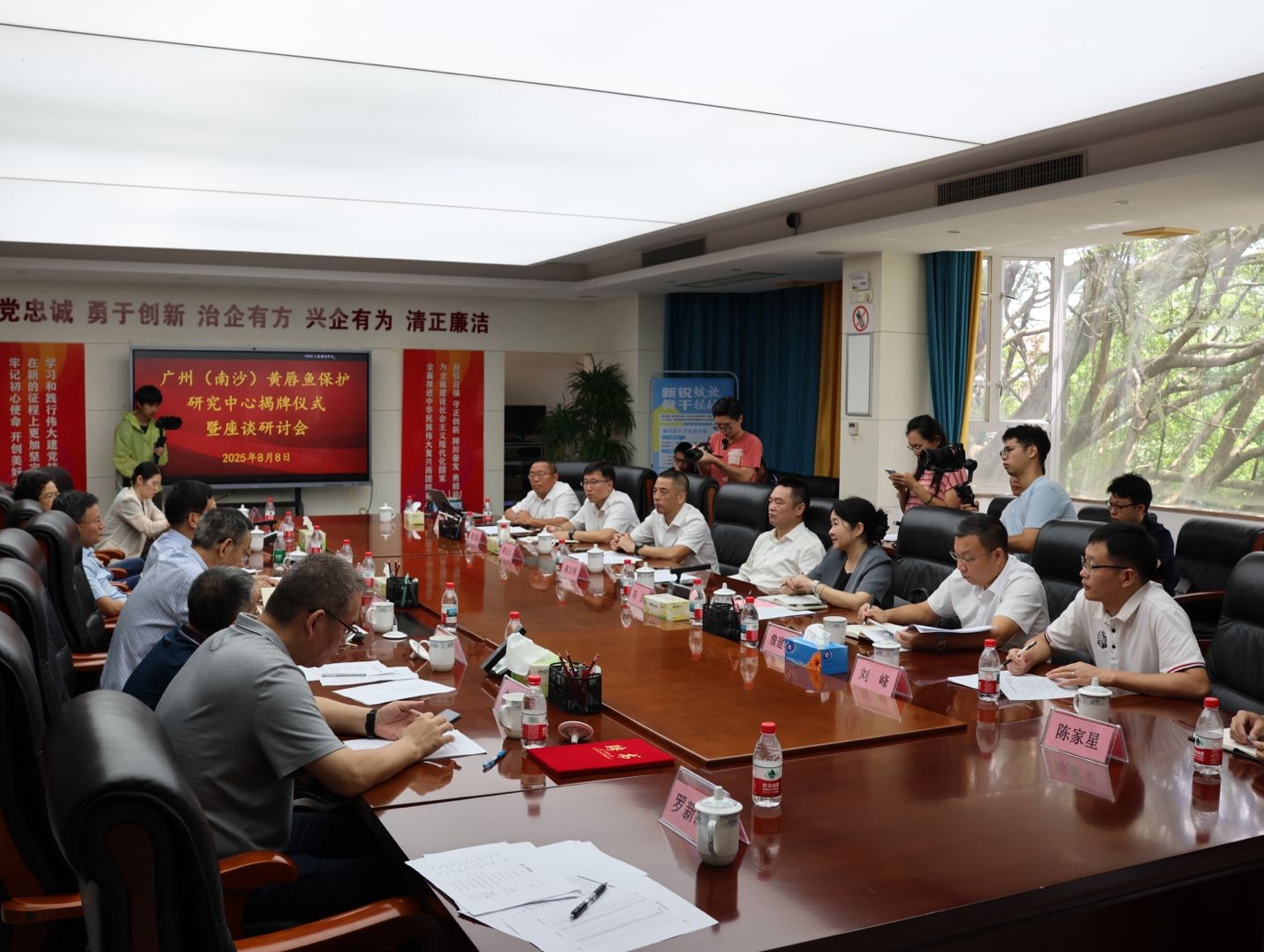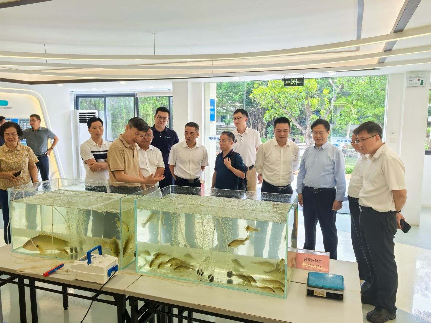广州市农业农村局渔业处处长陈波、广州市南沙区人民政府市管一级调研员蒋志刚、南沙区农业农村局总畜牧兽医师粱云尘、广州市农业农村科学院党委书记及院长詹建坡等共同见证了广州黄唇鱼取得首次育苗成功的重要时刻。
